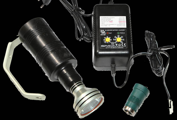 Die Ladezeit des internen 4,5Ah NiMh Akkus beträgt ca. 8 Stunden, danach ist die Lampe mit über einer Stunde Leuchtdauer für normale Nachttauchgänge geeignet. Geladen wird der Akku über ein Adapterstück das anstelle der Lampe eingesetzt wird.