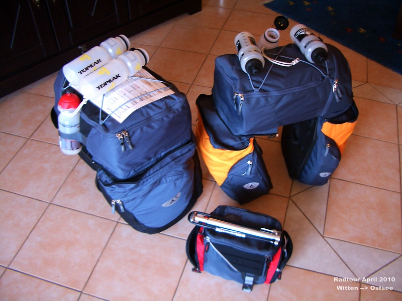 Es ist doch unglaublich was der ganze Kram wiegt, die gepackten Taschen stehen nun im Wohnzimmer und warten darauf am Fahrrad befestigt zu werden. Unsere Bedenken wachsen stetig, sind wir doch niemals zuvor mit diesen 20Kg Zusatzgewicht pro Rad gefahren. Das die Sorgen berechtigt waren werden wir erst später feststellen. Bei 700km Fahrtstrecke und 10 Tagen kommt man rechnerisch auf 70km pro Tag; ob wir die wirklich schaffen werden wird sich dann zeigen, vergangene Touren lagen in ähnlichen Bereichen, allerdings ohne Gepäck...