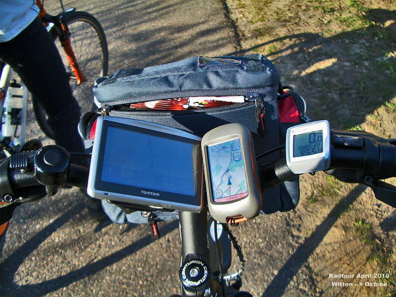 Eine Liste mit allen Utensilien die uns in den Gepäcktaschen begleiteten ist hier zu finden. Ein mobiler Internetanschluss (iPhone) sowie 2 Mobilfunkgeräte sind ebenfalls am Rad, wenn alle Stricke (und Sehnen) reißen, möchten wir nicht unvorbereitet nach Lösungen suchen müssen. Für die Pension-/Hotelsuche haben wir unser TomTom XL mit Fahrradhalterung eingepackt, da der Garmin auf Straßen recht ungewöhnlich navigiert; wir möchten ungern am Ende eines Tages noch 35km Umweg fahren wollen nur weil die Herberge nicht an einem Radweg liegt... bei dem Garmin kann man nämlich keine genaue Adresse eingeben sondern nur Wegpunkte oder Ortszentren.
