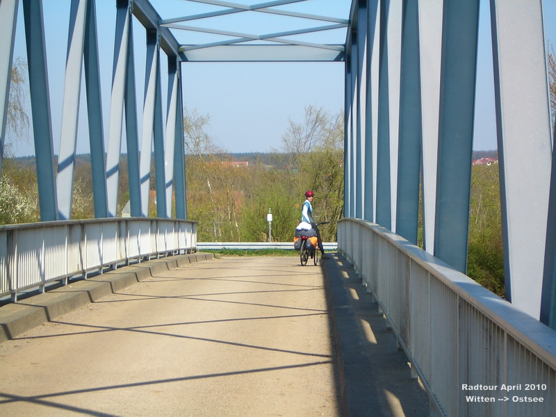 Nach Gesprächen mit Ortskundigen und hiesigen Eingeborenen entschieden wir uns Riesenbeck zu vermeiden und wollten relativ direkt durch Tecklenburg über den Teutoburger Wald fahren. Hätten wir gewusst das uns eine Bergetappe der übelsten Art erwartet, hätten wir wohl unsere geplante Route vorgezogen, aber hinterher ist man immer schlauer. Karena ist komplett bis zum „Gipfel“ gefahren, ich habe die letzten 100m das Fahrrad schieben müssen (Schnapp-Atmung lässt grüßen). Den Berg hinter uns ging es dann in einer Schussfahrt wieder ins Tal wo wir abseits der Hauptverkehrstrassen sehr schöne Radwege vorfanden. Nach Bramsche, Halen und Hüde ging es zum Dümmer See (Naturschutzgebiet), die Landschaft war herrlich, die Radwege überwiegend weit von der Zivilisation entfernt und gut zu befahren.