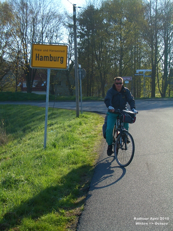 Tag 7 Von Buxtehude aus starteten wir um 8:00 Uhr Richtung Hamburg. Dieser Tag sollte nach dem enttäuschenden Vorabend etwas Besonderes werden. Als erstes bemerkte ich im Knie Probleme, die Achillessehnen-schonende Fahrweise hat nun eine Verlagerung des Problems nach sich gezogen. Davon unbeirrt ging es weiter Richtung Norden durch das Alte Land, leider ohne die Blüte, da fehlten noch ein paar Tage. Nach einem kurzen Stopp in Königreich mit Fotosession ging es dann über eine wunderschöne Landschaft nach Hamburg. |