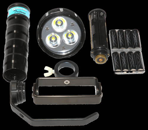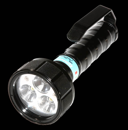 Eine hochwertige Gehäuseverarbeitung und die mitgelieferte Polstertasche runden das Bild ab und lassen die Tritone Super 3 LED in (mit) einem guten Licht dastehen. Der Lampenkopf wird mit 3 O-Ringen eingeschraubt, der Akku-Deckel mit Griff hat einen O-Ring. Die geriffelte Oberflächenstruktur der Lampe sichert eine gute Griffigkeit beim Ein-& Ausschalten (durch Drehen des Lampenkopfes) der Leuchteinheit.