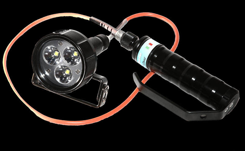 Die Gibielle-Tritone Super 3 LED Lampe liegt gut in der Hand, mit dem Handgriff minimal Kopflastig, kann aber gegen Aufpreis als Tanklampe (Kabel + Goodman-Handle) erweitert werden.