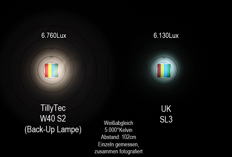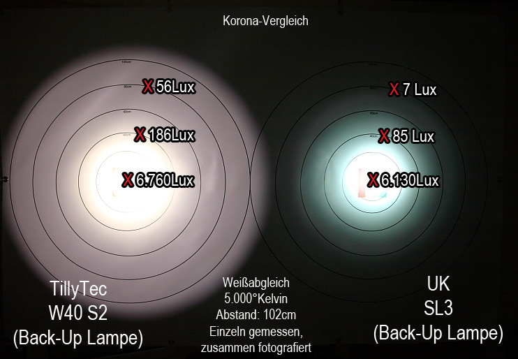 Leider bedeutet „S2“ aber auch das die Lampe etwas dunkler als ihr Vorgänger W40 ist. Hatte Tilly die W40 mit knapp 15.000Lux beziffert leistet der Nachfolger S2 da gerade mal 7.700 Lux im Peak. Die grosszügige Korona und die wirklich angenehme und schöne Farbtemperatur entschädigen aber den Output-Verlust.