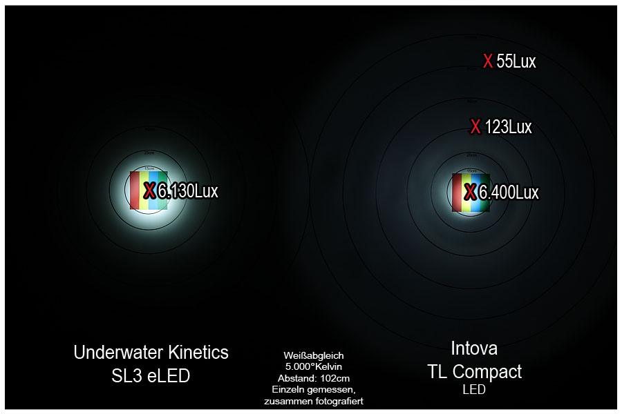 Die SL3 hat einen engen Beam (85cm Durchmesser bei 4m Abstand) ohne das viel Streulicht verschwendet wird. Der Output liegt mit vollen Batterien (3x Babyzelle / Typ C/ LR14) bei satten 370Lux auf 4m Abstand, nach 2 Stunden noch knapp 276Lux. Laut Hersteller soll die maximale Leuchtdauer mit einem Satz Batterien bei rund 30 Stunden liegen, getestet habe ich das allerdings nicht. Die Farbtemperatur liegt bei ca. 5.800°Kelvin, variiert aber minimal zwischen den beiden Exemplaren die mir zur Verfügung stehen, scheint wohl eine gewisse Serienstreuung / Toleranz zu sein. Im Vergleich mit einigen anderen Lampen wirkt das Licht der UK SL3 etwas bläulich / grünlich. Das Gewicht der Lampe beträgt (entgegen der Bedienungsanleitung nicht 235 Gramm) mit Batterien 370 Gramm.
